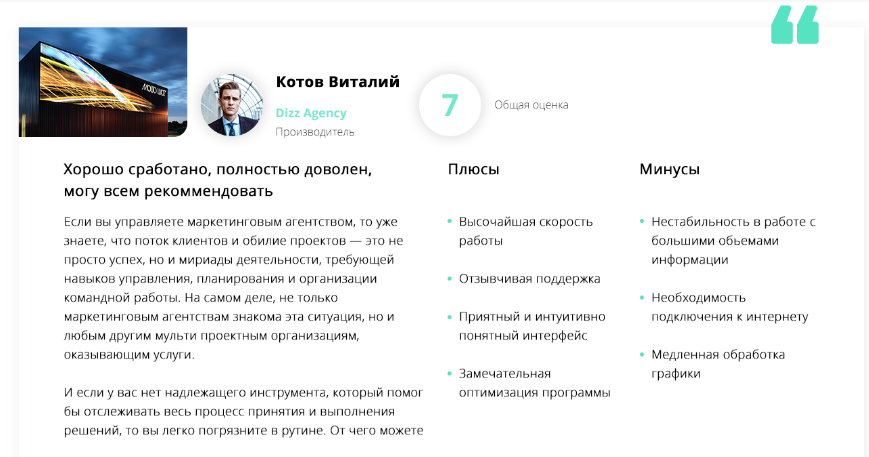Это история успеха, готовый отзыв с информацией о решенных с помощью продукта проблемах и задачах. Вот пример